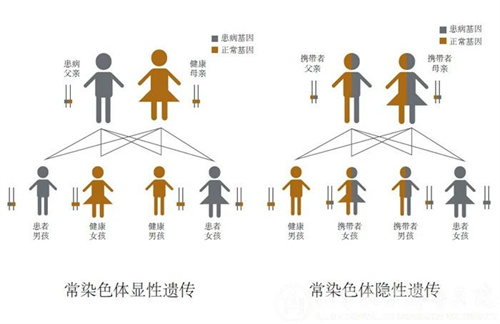 在常染色体1-22号上的一对等位基因,当只有一个“坏的”(突变)基因时并不会致病,只有遇到另一个相同“坏的”(突变)基因才会致病,就是我们通常说的常染色体隐性遗传(简称常隐)。